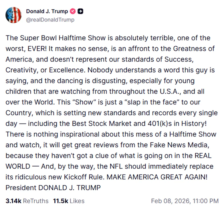 «¡El espectáculo del medio tiempo del Super Bowl es absolutamente terrible, uno de los peores de la historia!», disparó Trump en su publicación.